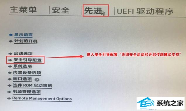 2、进入Bios后,将移动键盘到“先进”选项下,选择"安全引导设置",按回车键进入配置;