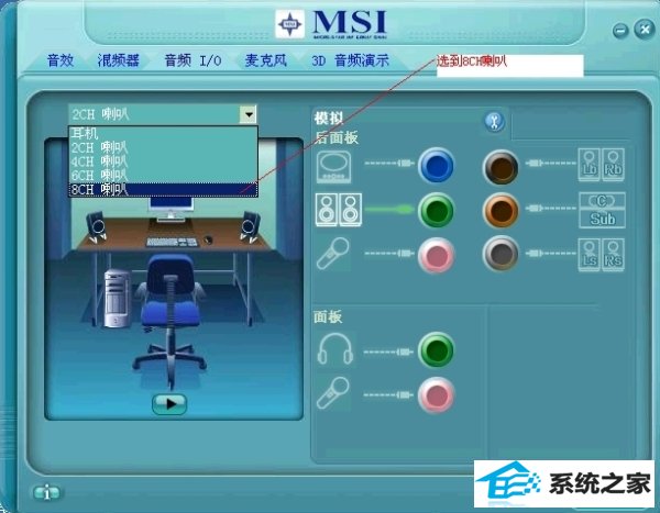 1.选择“音频i/o”,将“2CH喇叭”改为“8CH喇叭”这样做可以解决游戏内声音小的问题