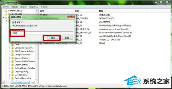 4、 在“编辑字符串”窗口中,我们将数值数据中的12000改为1000,即1秒,然后点击“确定”,关机重启即可。