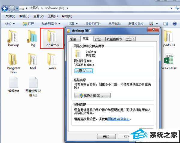 2.打开文件夹属性窗口后,点击打开“共享”选项,然后再下面的“网络文件和文件共享”设置框里面点击“共享”按钮