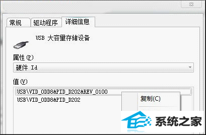 第二步.双击U盘项进入属性页面,接下来打开【详细信息】面板,将其中的【属性】更改为【硬件id】,然后复制下硬件id中第一个值。
