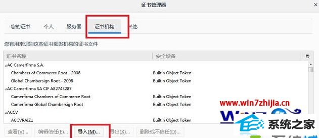 5、切换到“证书机构”,点击“导入”,找到刚才解压至桌面或其他位置的“根证书”进行安装即可。