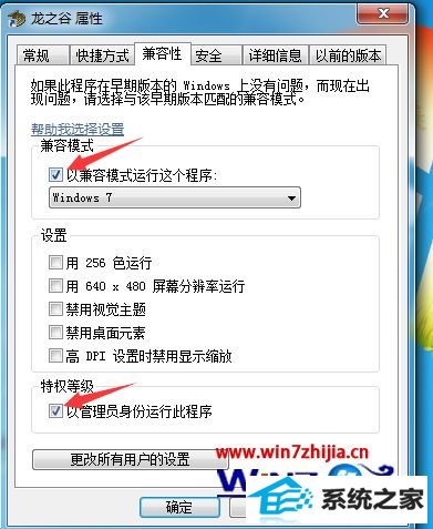 5、在图中兼容性中选择与你电脑系统兼容的方式运行,并设置成以管理员身份运行;