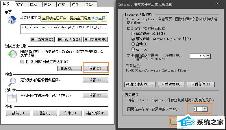 9、点击“浏览历史记录 设置”按钮,并在弹出的窗口中将“网页保存在历史记录中的天数”设置为“0”,点击“确定”完成设置。