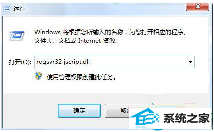 8、在运行命令行,输入【regsvr32 jscript.dll】命令点击确定,然后输入【regsvr32 vbscript.dll】点击确定,注册完成,问题解决。