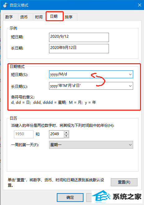3、之后在配置界面中,定位到上方的日期,将长日期格式复制粘贴到短日期格式内容框,再点击应用和确定即可。