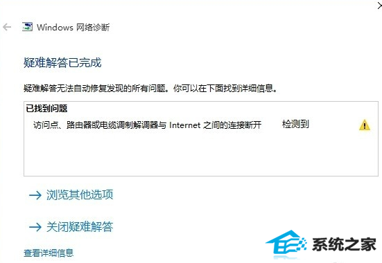 3、待“win网络诊断”操作完成后,将自动给出网络故障的根源及处理方法,如图所示: