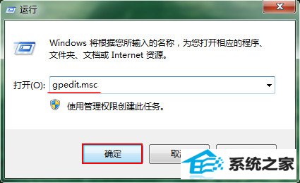2、进入运行窗口,直接输入“gpedit.msc”指令,按下“确定”按钮,如图所示: