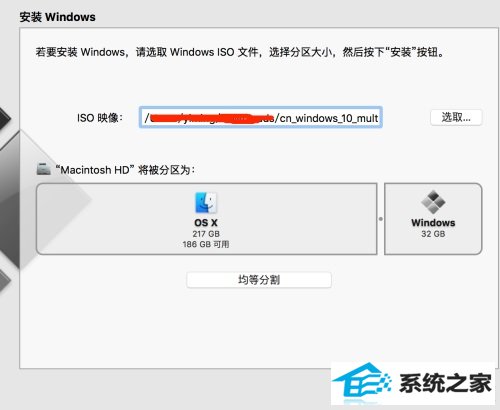 4.打开Boot Camp助理后,点击继续按钮出现如图所示选取镜像文件,给磁盘配置分区,主编这里配置的是80GB的容量。