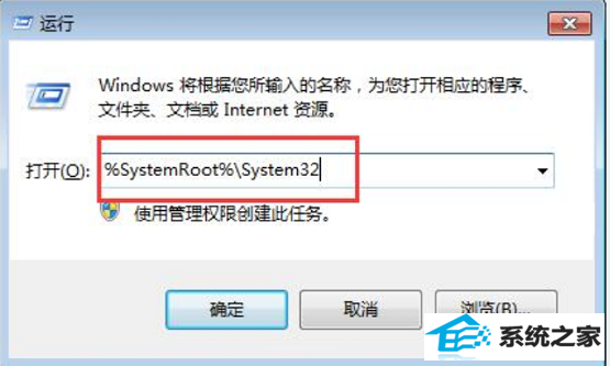 1、按win+r组合键打开运行窗口,输入“%systemRoot%\system32”(可直接复制粘贴),回车确认。如下图所示: