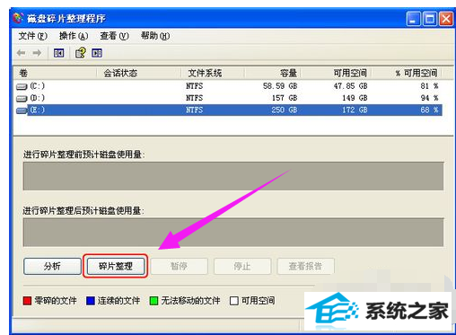 进入磁盘碎片整理程序页面,所有的分区盘都显示出来,可以选定点击任何一个磁盘,然后点击(磁片整理)。