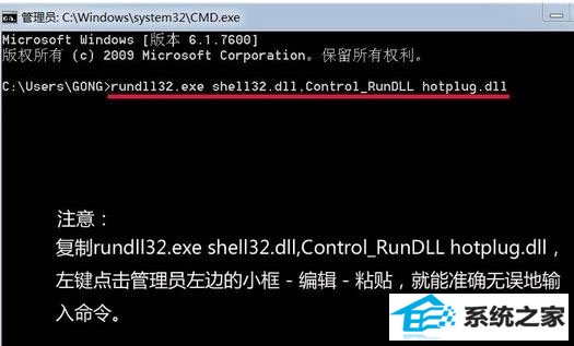 2、在管理员命令窗口输入: rundll32.exe shell32.dll,Control_RundLL hotplug.dll,回车。