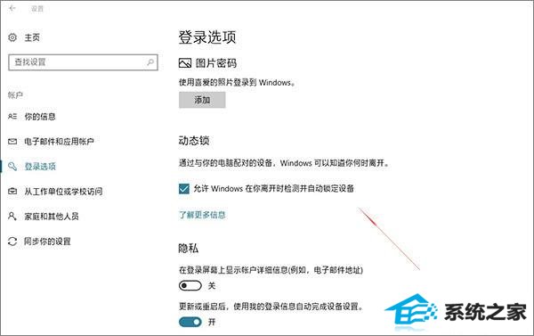 配置办法是,首先打开笔电与手机的蓝牙模块,将两端互联。接下来点击“配置”→“账户”→“登录选项”,将“动态锁”→“允许win在您离开时自动锁定设备”勾选。