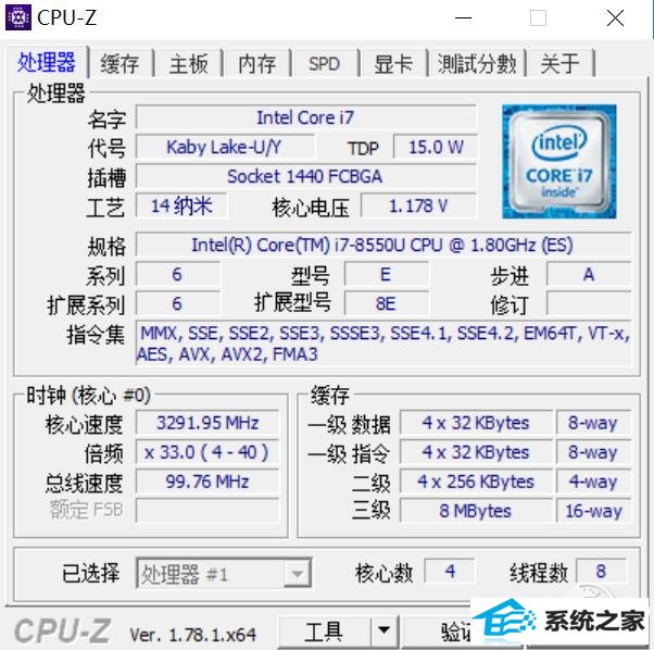 从图中你们可以看出Cpu-Z读取出的各种信息,14纳米的工艺、15w的Tdp、单核睿频为4.0GHz、最大倍频为40。