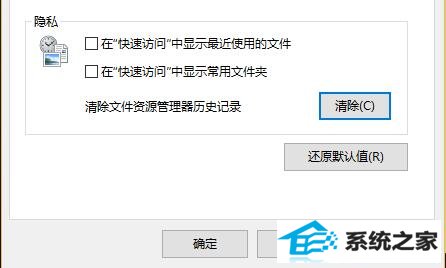 3.在文件夹选项的常规配置窗口中,把“隐私”分类下的两小项前面的小框内的“√”取消,再左键单击右下角的“清除”按钮,清除文件资源管理器历史记录。