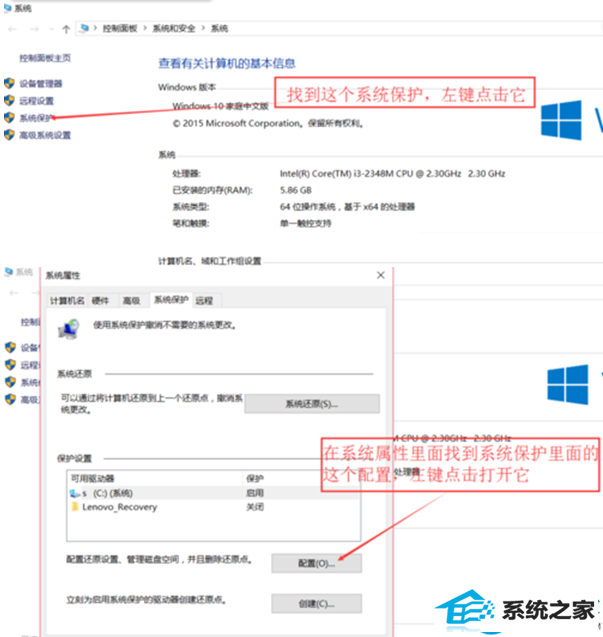 4、找到属性页面里面的这个系统保护,左键点击它,将会打开一个新的窗口,在系统属性里面找到系统保护里面的这个设置,左键点击打开它。