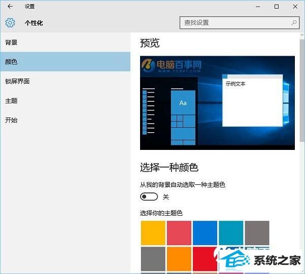 3、在个性化配置中,再点击“颜色”配置,之后在右侧就可以选择一种自己喜爱的颜色,作为开始菜单与主题的背景颜色了,如图。