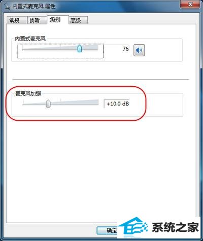 3、在弹出的“内置式麦克风属性”对话框中,点选“级别”选项卡,根据需要拖动滑块调节麦克风加强,然后点击“确定”,如下图所示: