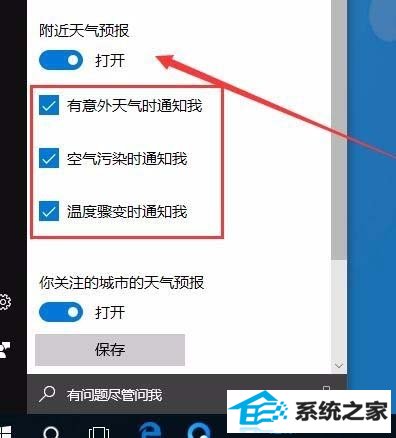 4、把“附近天气预报”下面的开关配置为“打开”,接着选中下面的“有意外天气时通知我”、“空气污染时通知我”、“温度骤变时通知我”三个复选框,看见木有,和下面一样进行配置: