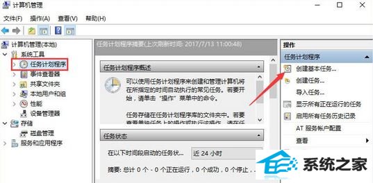 2、打开任务计划程序,右边有一个创建基本任务和一个创建任务,你们先点开创建基本任务,如图;