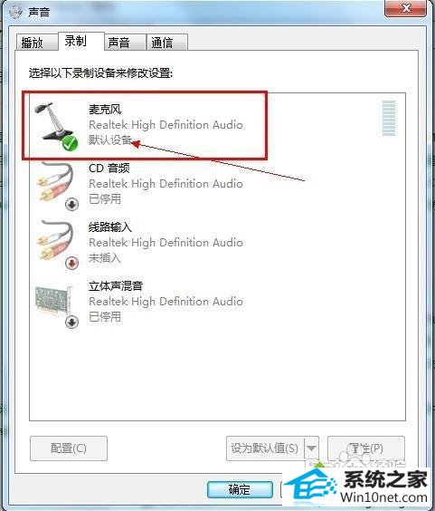 2、切换到“录制”选项卡,看看麦克风是否被设置为默认设备(注:有的声卡可能会显示多个麦克风选项);