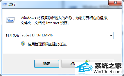 2、在运行位置中输入命令:subst d: %TEMp% 单击确定;